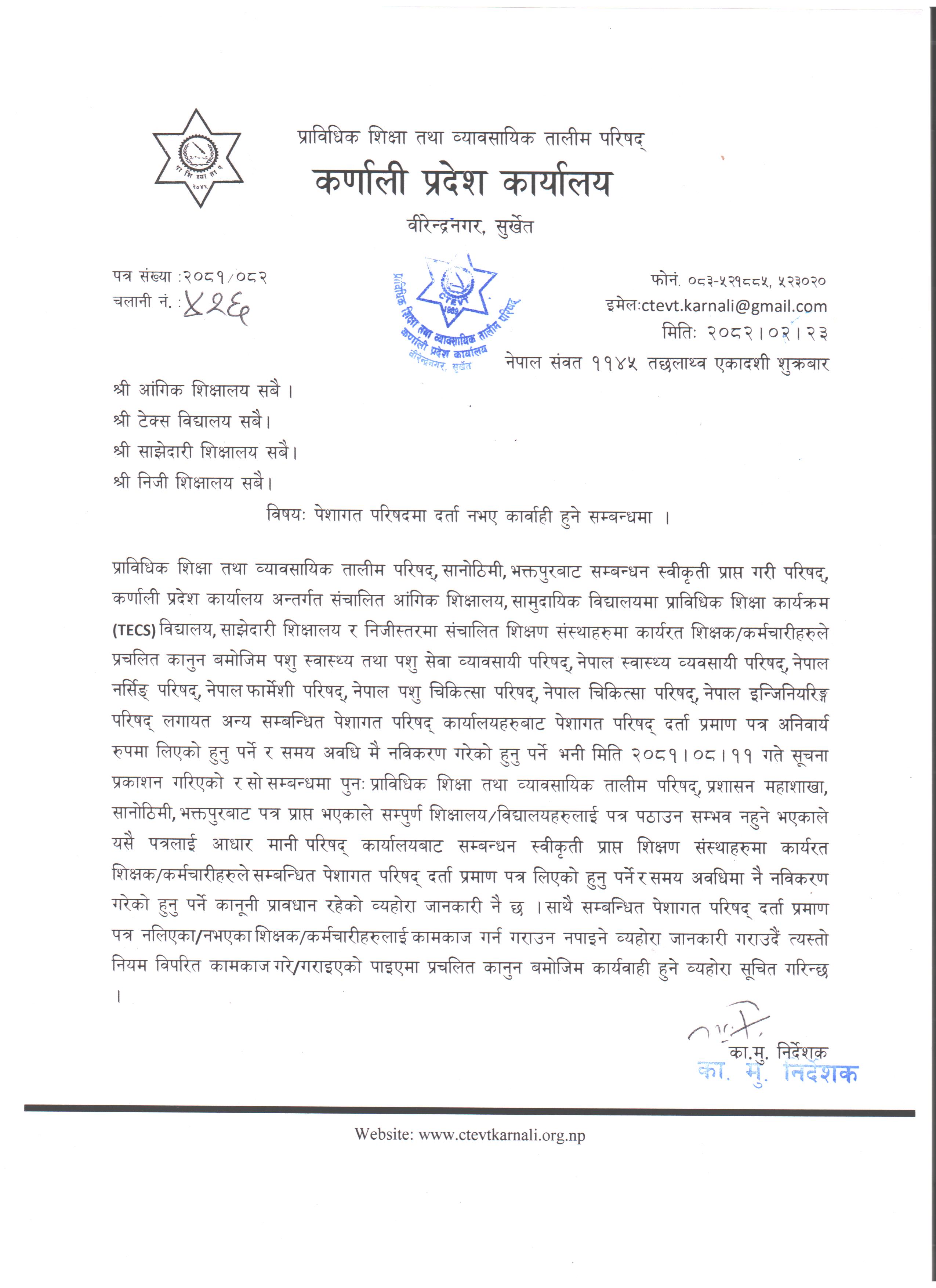 प्राविधिक शिक्षा कार्यक्रम संचालन गरिरहेका परिषद्का टेक्स,साझेदारी शिक्षालय/ विद्यालयहरूले कार्यक्रम संचालन अनुदान प्रस्तावना पेश गरेका शिक्षालय/ विद्यालयहरुलाई अपुग कागजात पेश गर्ने सम्बन्धी अत्यन्त जरुरी सूचना 2081-01-30