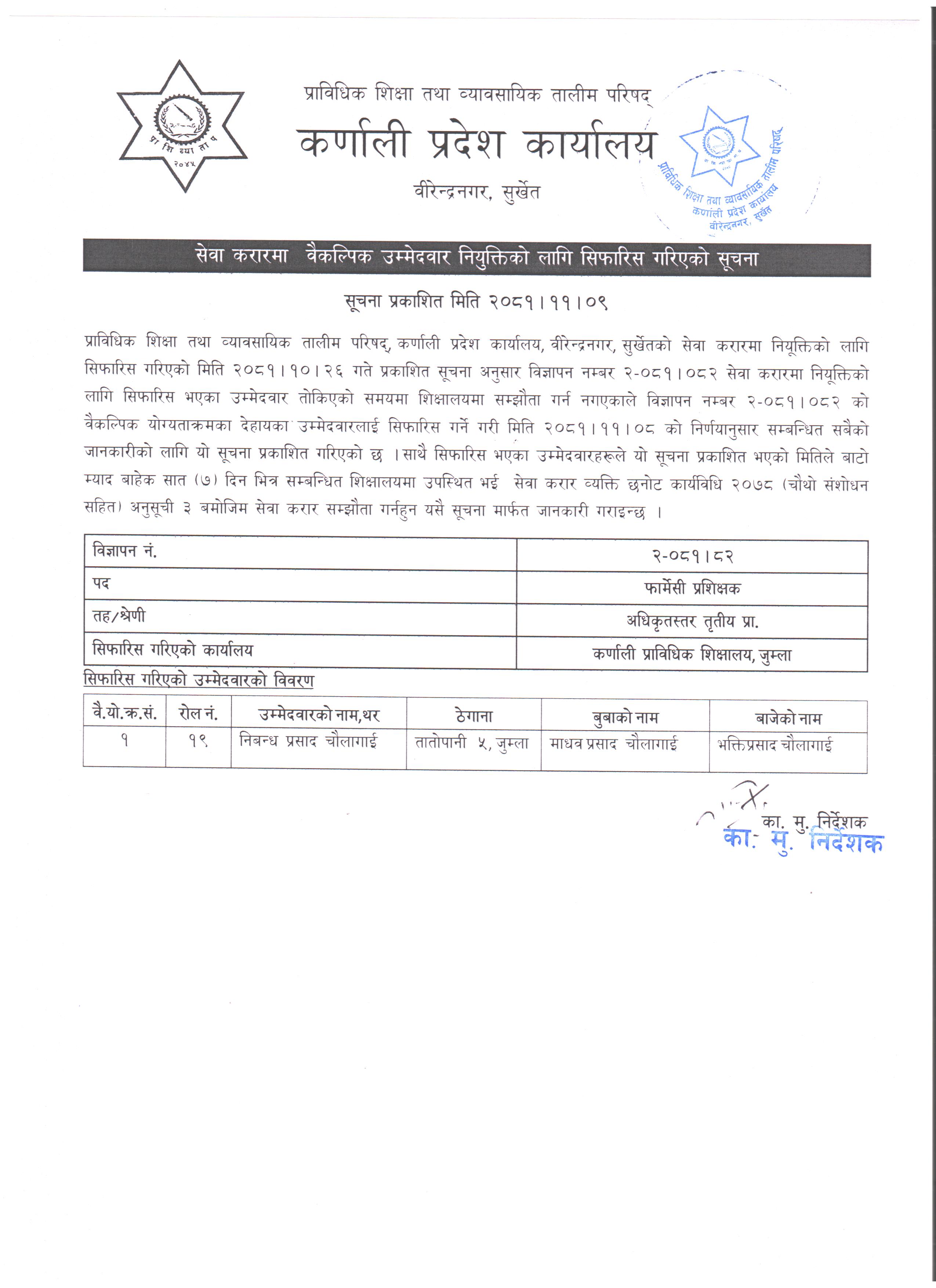सेवा करार वैकल्पिक उम्मेदवार नियुक्तिको लागि सिफारिस गरिएको सूचना (2081-09-11)